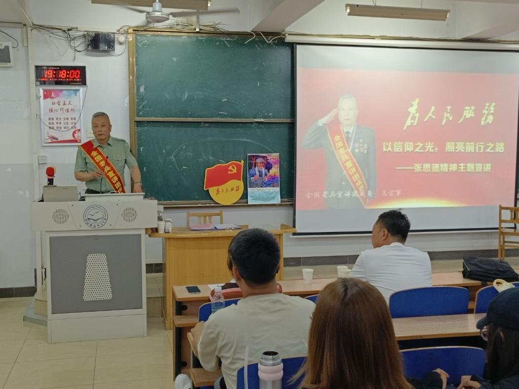 主讲人王宝军以“以信仰之光,照亮前行的路”为主题,从张思德精神的起源切入,动情讲述了张思德的成长经历和英勇事迹,结合具体案例,深刻阐释了以“对党忠诚、为民服务、甘于奉献”为主要内涵的张思德精神,着重点明了张思德精神的时代价值。同时,王宝军结合个人在公安系统工作中的经历和以及多年参与志愿服务的感悟,分享了自己和身边人对张思德精神的践行,并号召广大青年学子不仅要以笔墨书写时代华章,更要以赤子之心筑牢信仰之基,始终保持对党的绝对忠诚与对人民的深厚情怀。