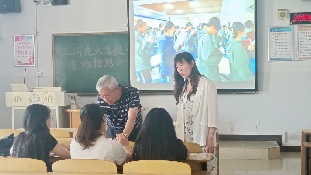 三河市光大学校老师先介绍了学校基本情况。三河市光大学校创建于2015年,以“求实尚美、厚德博学”为校训,学校设施一流、管理高效,拥有一套懂业务、善管理、务实高效的领导班子,同时师资力量雄厚,老中青相结合,教学成绩突出。老师们说明了学校的招聘条件和福利待遇,解答了同学们的疑惑。结束后,同学们进行了精彩的试讲。
