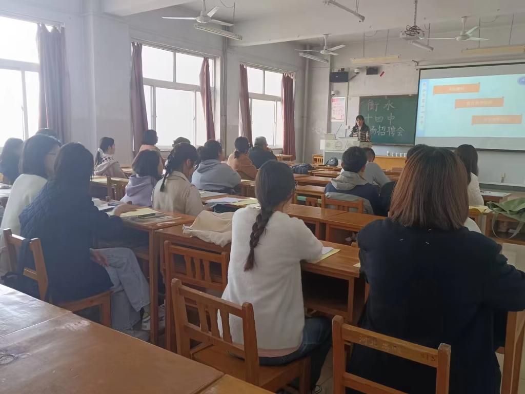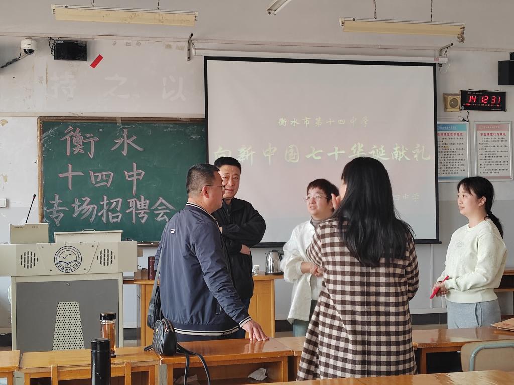 会议伊始,衡水十四中学带队教师介绍了衡水十四中学整体校园环境与学风建设,接着解答了同学关心的工资标准、福利待遇、住宿环境等问题。最后,多名同学参加试讲,给衡水十四中学到场老师留下深刻印象,多名同学与衡水十四中学老师交换联系方式,达成就业意向。