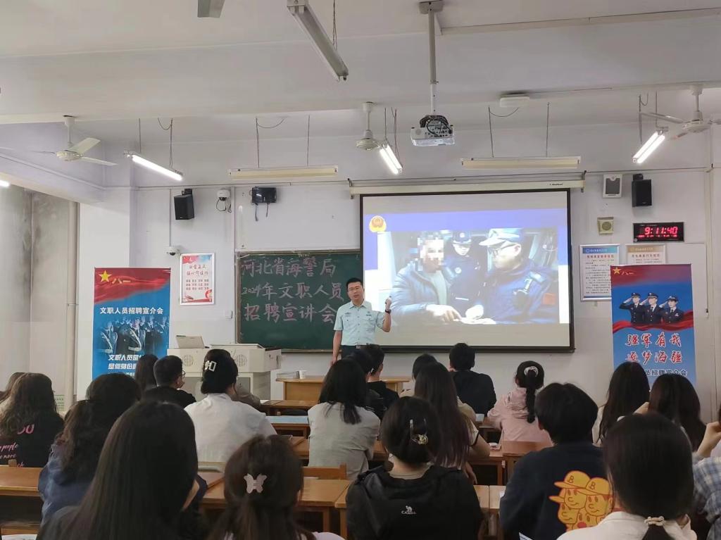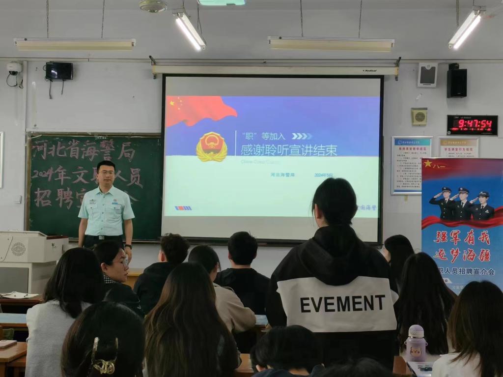 会议由河北省海警局干事进行主讲,我院张永丰书记,刘艾嘉老师到场指导。会议伊始,河北省海警局宣讲员首先介绍了海警的职责和工作内容、文职人员的主要情况,并与同学们一起观看了中国海警文职人员公开招聘宣讲片。其次,河北省海警局宣讲员围绕文职人员的三种分类——管理类、专业技术类、专业技能类阐述其定位、从事工作、政策制度、退出机制以及同学们关心的工资薪酬,住房保障,福利待遇等问题。河北省海警局宣讲员专业幽默的宣讲深深吸引了同学们的兴趣,均积极踊跃提问问题。