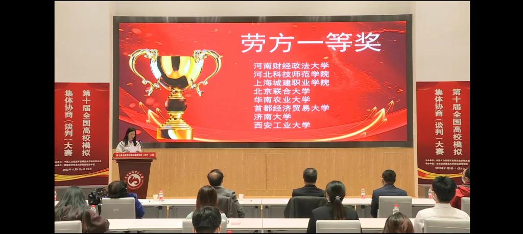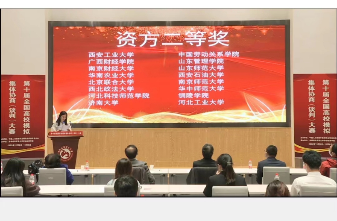 第十届全国高校模拟集体协商(谈判)大赛,是由中国人力资源开发研究会劳动关系分会主办、首都经济贸易大学承办的,以大学生模拟集体协商(谈判)为主题的比赛。本次大赛采用线上线下相结合的模式,共有来自全国12个省市36所高校的72支队伍参加,参赛师生共计380余名,邀请来自政府部门、工会、企业及高校各界多名专家担任评委。本赛事本着推动以人为本、合作共赢的集体协商(谈判)模式,旨在提升我国劳动关系人才的专业核心素质与能力,搭建校际人才培养机制与模式交流的平台,构建和谐劳动关系。