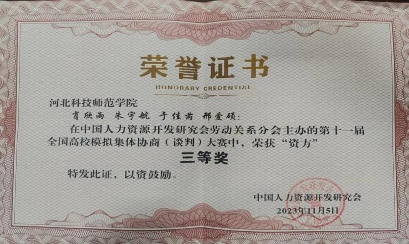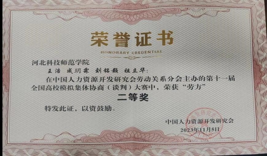 经过两天的激烈角逐,我校学生表现优异,资方代表队荣获大赛三等奖,劳方代表队荣获大赛二等奖,成玥霖、邢爱硕两位同学荣获最佳谈判员一等奖,王晓燕、刘秀清、辛宇鹤三位老师荣获优秀指导老师一等奖。