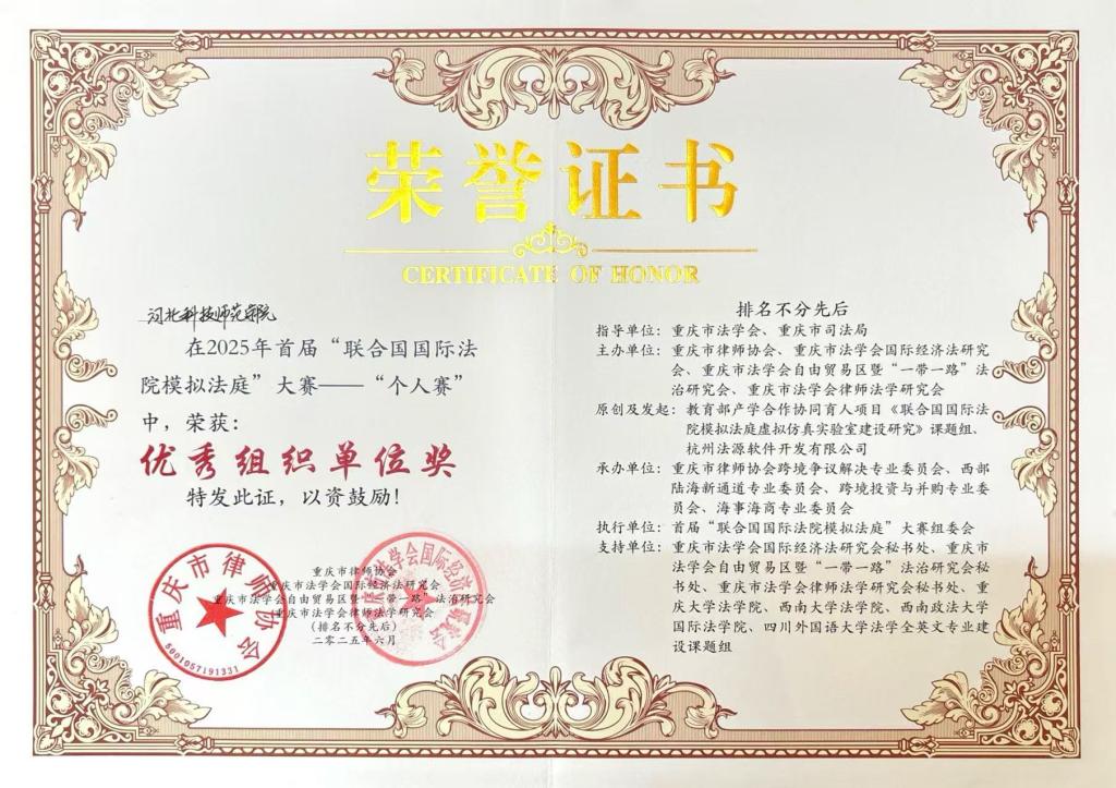 近日,在2025年首届“联合国国际法院模拟法庭”大赛——“个人赛”中,河北科技师范学院凭借出色的组织工作和师生的优异表现,荣获“优秀组织单位奖”,买球官方网站赵福江、郝世坤等老师获优秀指导教师奖。该奖项由重庆市律师协会、重庆市法学会等多家权威机构联合颁发。